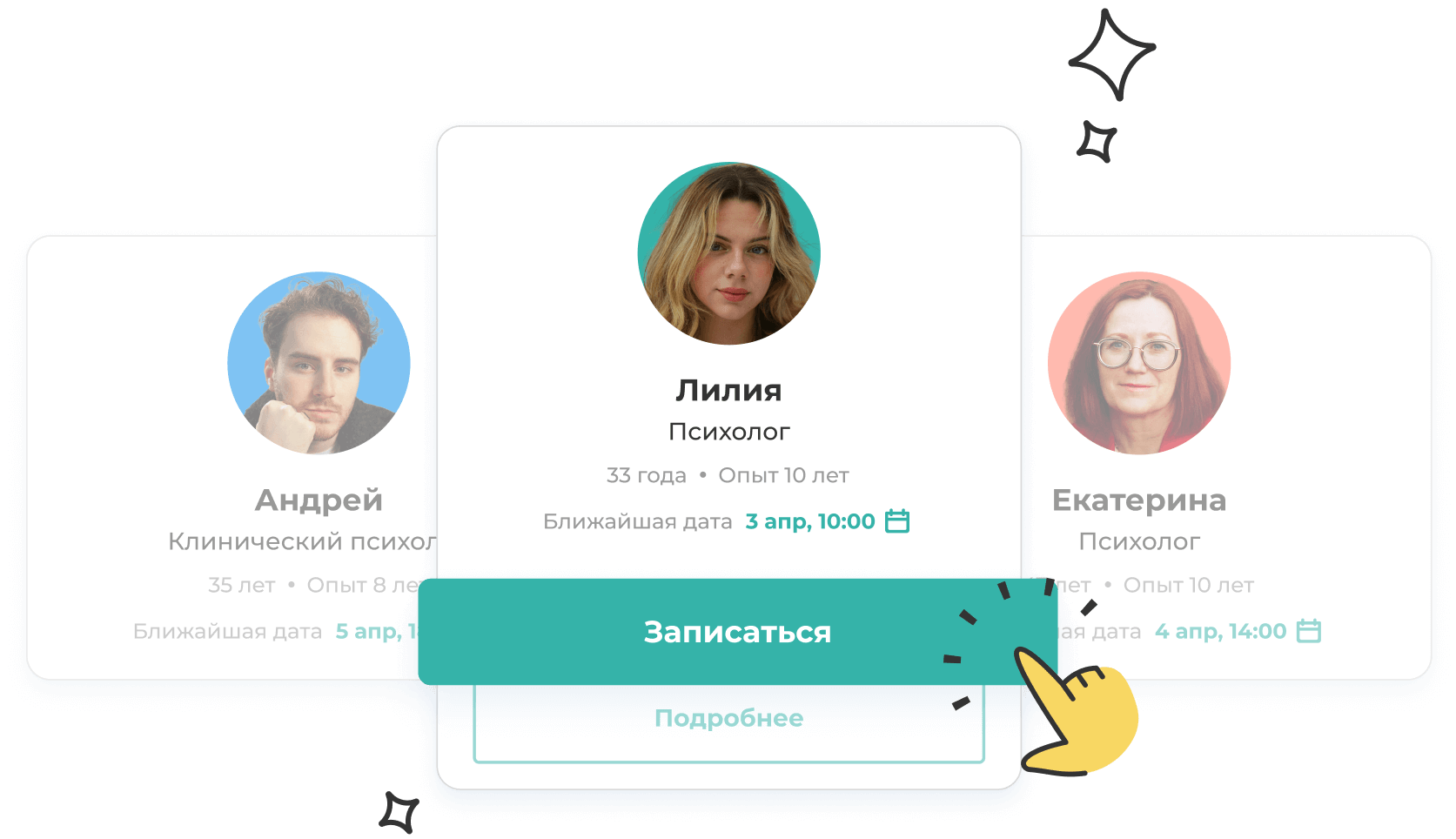 Поиск психолога был для меня очень стрессовым, но благодаря удобному фильтру по специализации, опыту и методам работы я быстро нашла подходящего специалиста.